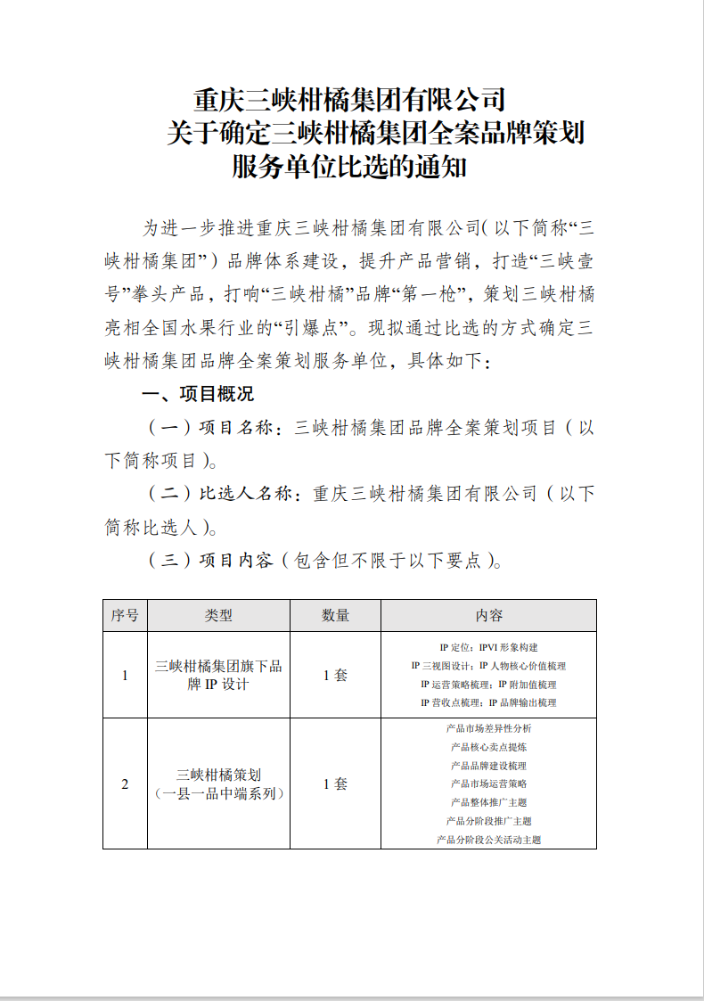 重慶三峽柑橘集團有限公司關(guān)于確定三峽柑橘集團全案品牌策劃服務(wù)單位比選的通知